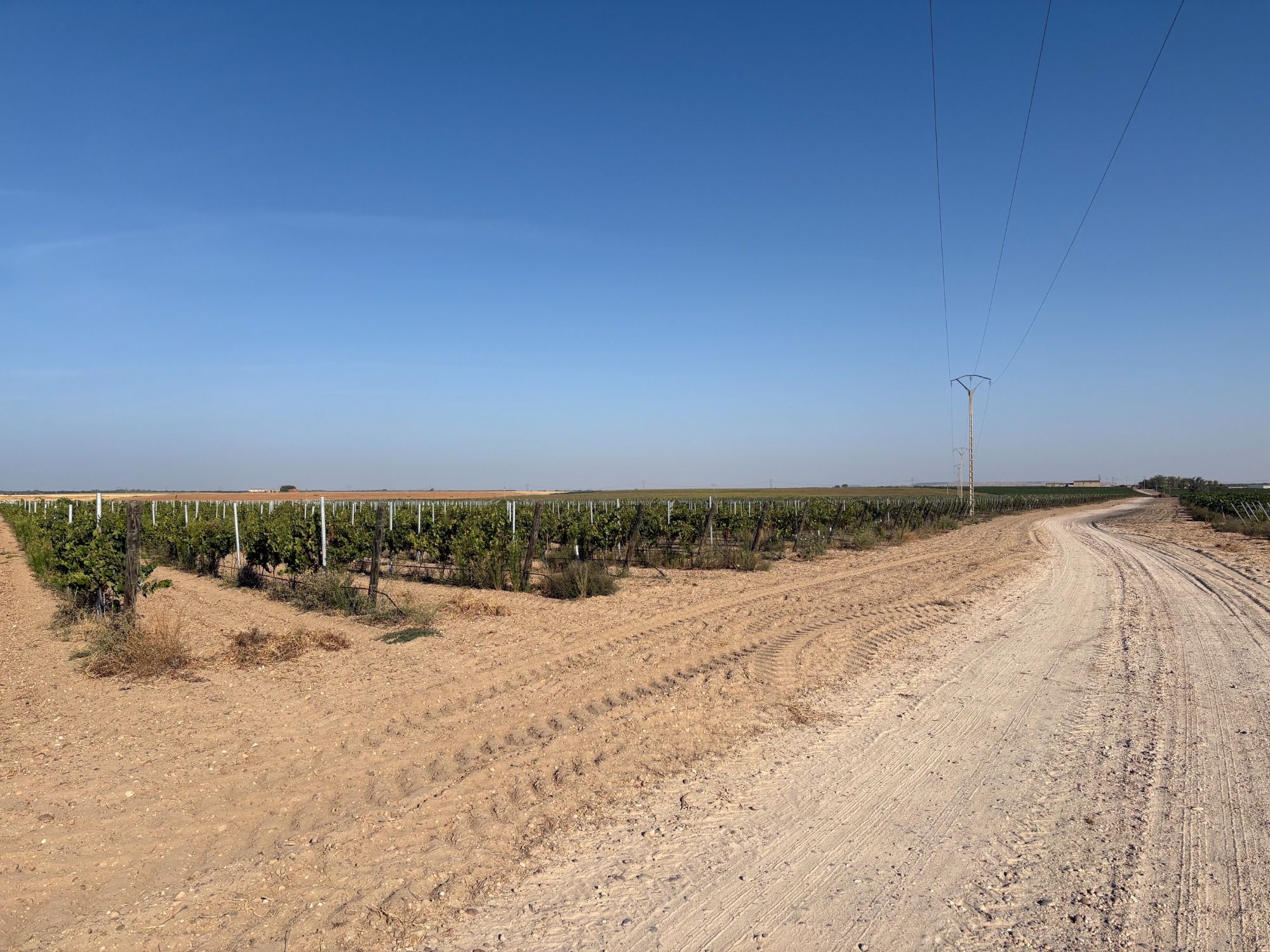 Today’s ride was much more pleasant and easier than yesterday, less hills, and the wind was much diminished, although still a little breeze to my face. I changed my preference on my Komoot app to road cycling rather than touring, and I think that made a difference in keeping me on tarmac roads rather than on tracks. Even still, I did about a third of today’s trip on dusty tracks, and both me, the bike and my bags were covered in white chalky dust by the end of the day. I passed through Valladolid, which is really scrappy on the outskirts to the north, lots of derelict industrial stuff, but a nice historic centre, and then a pleasant ride out to the south, which is definitely the des res bit of Valladolid. Mostly classy apartments, which seems to be the style of habitation in Spanish cities, even suburbs. Tordesillas is on the River Duoro, as is tonight’s campground, and the wine I had this evening with my dinner is a Duoro Tinto. Very nice.