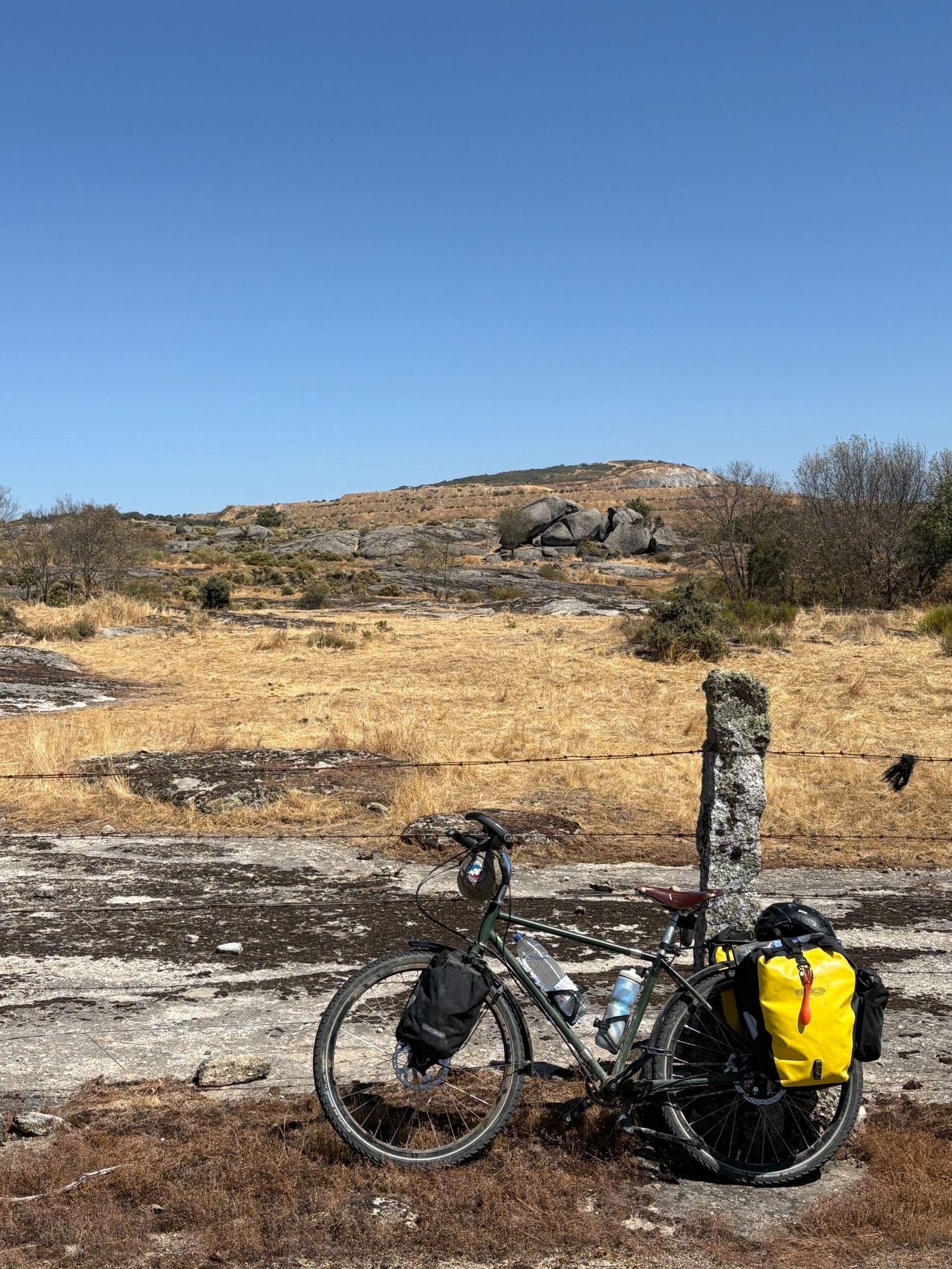 A nice ride today in very pleasant weather, and no rough tracks ! The route out of Salamanca had a good cycle route, and then the road was wide, good margin and not busy. I was directed off that main road on to some provincial roads that took me over some steep climbs, up 600 meters in the morning, and then another 600 meter climb as I approached Bejar. The countryside is very expansive with wide horizons, lots of wheat fields already harvested, and then in to granite country and over a range of Sierra to Bejar, which is itself not exactly flat ! I lucked out at lunchtime in a little town that I came across, where there was a bar at which I was able to get some lunch and stock up on water, but so often in these little towns and villages there is nothing on offer. I wonder, outside bigger towns, where people shop and get groceries, because I struggle to find anywhere most days. Mind you, there is always a pharmacy in most of these places ! Sometimes , like today, a local bar, which will offer simple tapas. But you can't rely on these places being there. It’s always a daily concern as to where to stock up along the route.